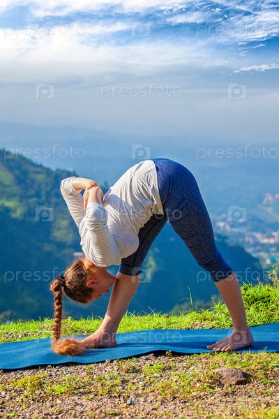 Женщина занимается йогой Аштанга Виньяса на открытом воздухе