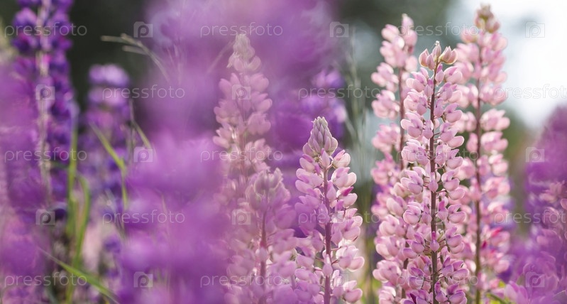 Цветение полевых крупнолистных люпин или садовых люпинов в начале лета, большой план с выборочным фокусом