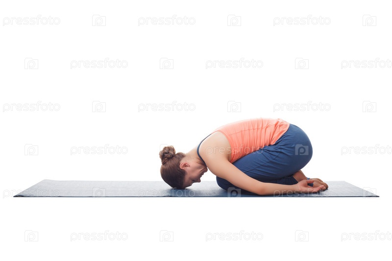 Красивая спортивная женщина-йогиня практикует йогу асана баласана (поза ребенка) - поза отдыха или контрасана для многих асан, изолированных на белом