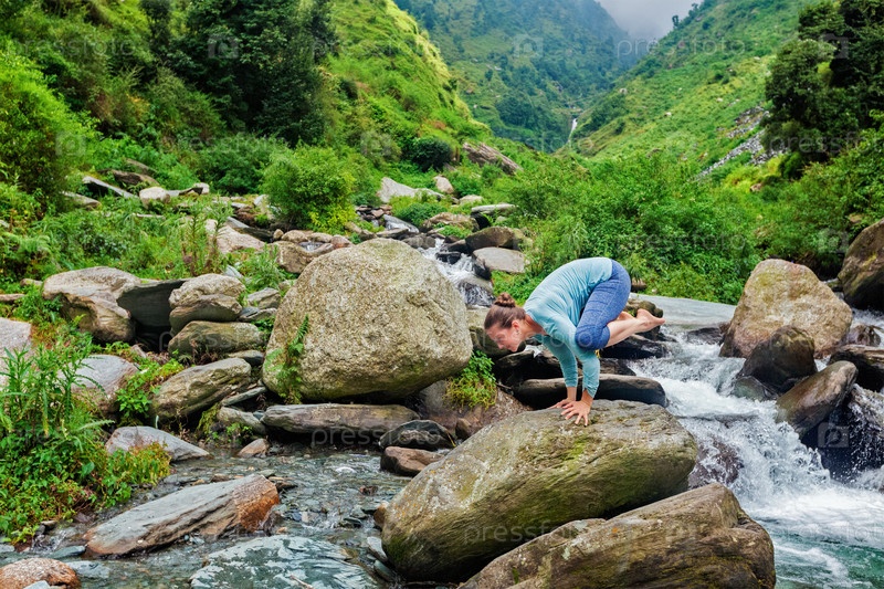 Женщина делает асану Какасана - баланс рук в позе вороны на открытом воздухе у тропического водопада