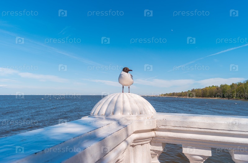 Черноголовая чайка сидит на заборе на набережной нижнего парка Петергофа на фоне берега Невской губы