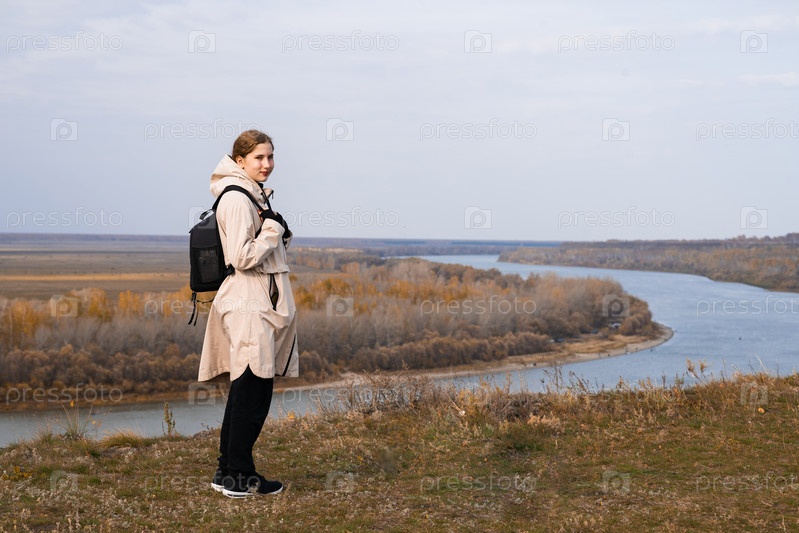 Маленькая девочка стоит на высоком берегу и смотрит на красивую природу