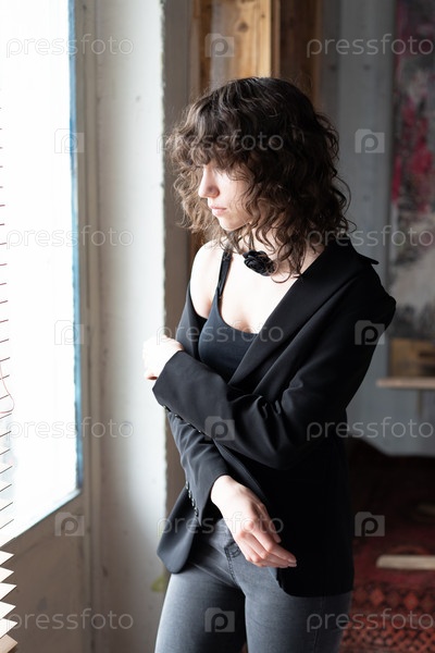 Молодая красивая женщина стоит в черной одежде в старой квартире