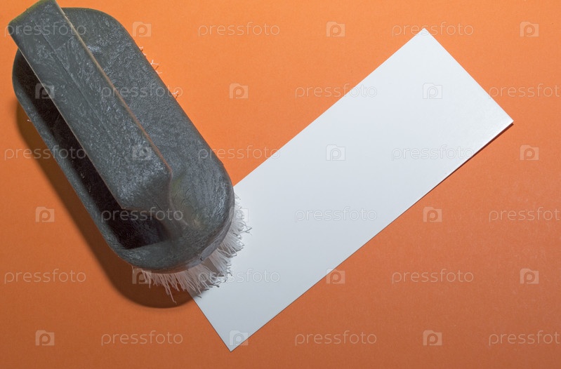 Концепция очистки. Черная кисть с белой щетиной на оранжевом фоне с пустым белым листом для текста