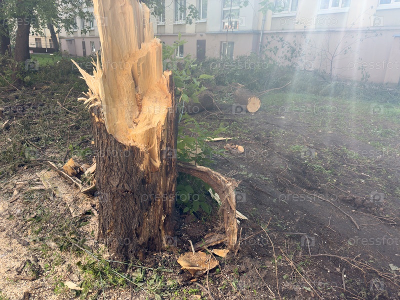 Упавшее дерево после урагана летом в городе