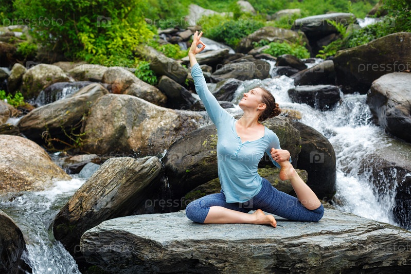 Женщина занимается йогой на открытом воздухе у тропического водопада
