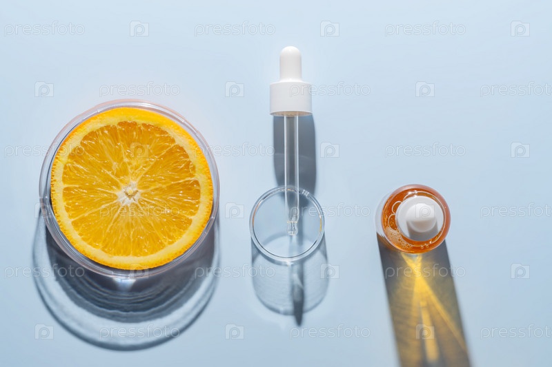 Косметические лабораторные эксперименты и исследования с апельсином и ингредиентами для натуральной красоты и органических продуктов по уходу за кожей. пустая бутылка для этикетки, концепция бионауки. Альтернативная медицина. спа