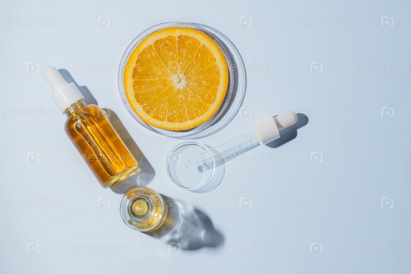 Лабораторные исследования цитрусовых. производство косметики, экстракция AHA-компонентов. тестирование косметологии по уходу за кожей. чашка Петри с куском апельсина и пипетка