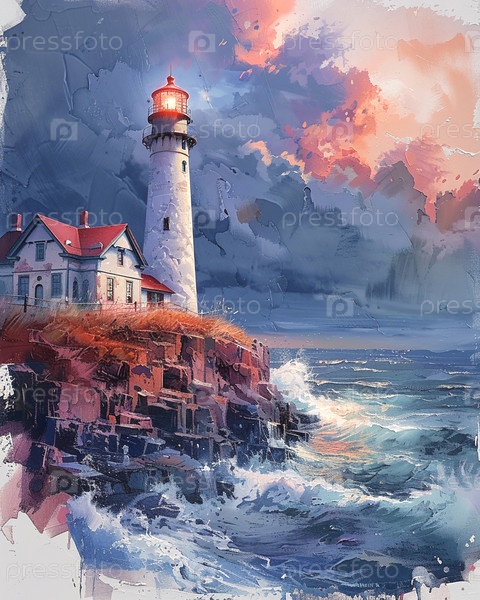 Рисунок маяка, стоящего на краю скалы на фоне бурного моря и темно-синего неба