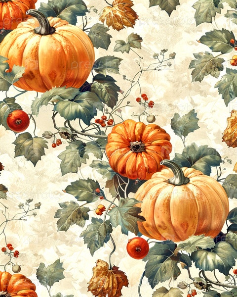 Осенний фон из больших и маленьких оранжевых тыкв и зеленых листьев