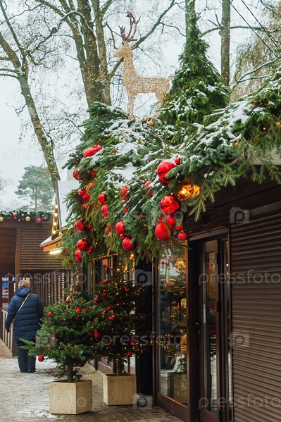 Калининград, Россия - 2022, 4 декабря: Красные елочные игрушки и еловые ветки на улице. Украшаем город к Новому году
