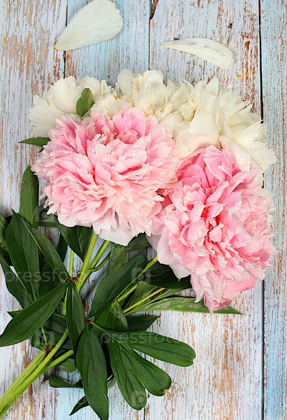 Букет красивых пионов на старом деревянном фоне, Абстрактная цветочная композиция, плоская планировка, летний баннер. Креативный современный букет. Поздравительная открытка и концепция праздника с цветами,