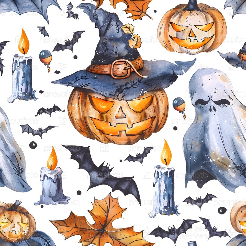 Акварель Счастливый Хэллоуин бесшовный узор с резной тыквой фонаря Джека О в шляпе, жутким призраком, летающей летучей мышью, страшной головой зомби, свечами на белом фоне. Ручная роспись на тему 31 октября