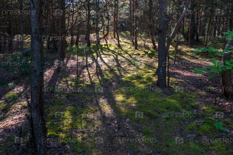 Сосновый лес вечером. Красивые тени от деревьев в лесу