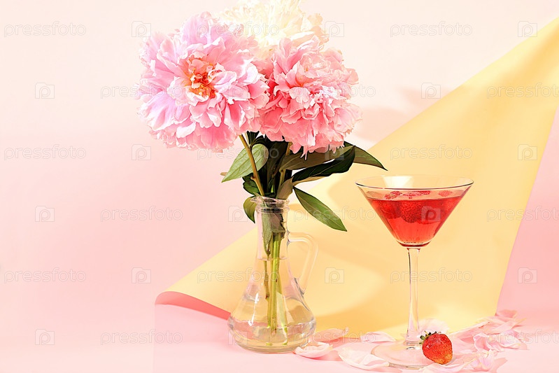 Современный натюрморт с розовым мартини, алкогольным коктейлем, клубникой и цветами пиона на элегантном современном фоне, минимальная концепция бара и праздничной вечеринки, кафе, рекламный баннер, выборочный фокус,