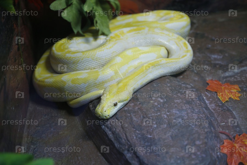 Змея питон спокойно отдыхает на камнях. Зоопрак