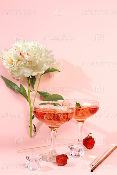 Современный натюрморт с розовым мартини, алкогольным коктейлем, клубникой и цветами пиона на элегантном современном фоне, минимальная концепция бара и праздничной вечеринки, кафе, рекламный баннер, выборочный фокус,