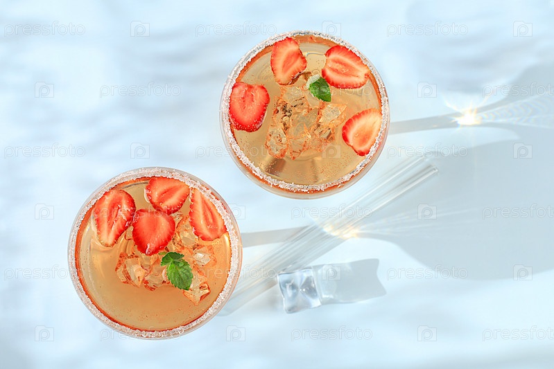 Современный натюрморт с розовым мартини, плоской планировкой, алкогольным коктейлем, клубникой на элегантном современном фоне с длинными тенями, минимальной концепцией для бара и праздничной вечеринки, кафе, рекламным баннером, избирательным фокусом,