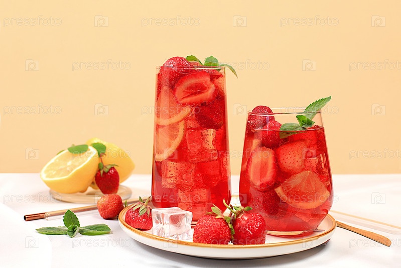 Клубничный чай со льдом или мятно-лимонный коктейль — рецепт освежающего летнего напитка. Бокалы с ягодно-фруктовым лимонадом на светлом бетонном столе, детокс-диета и концепция похудания, меню ресторана