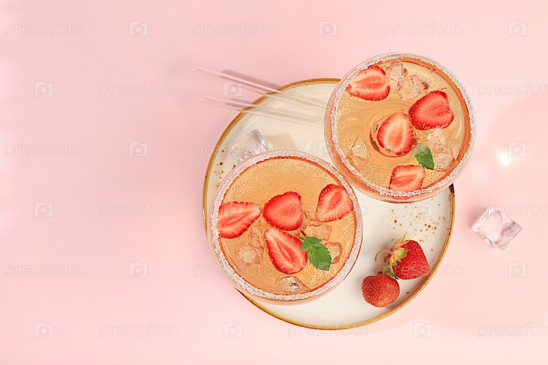 Современный натюрморт с розовым мартини, плоской планировкой, алкогольным коктейлем, клубникой на элегантном современном фоне с длинными тенями, минимальной концепцией для бара и праздничной вечеринки, кафе, рекламным баннером, избирательным фокусом,
