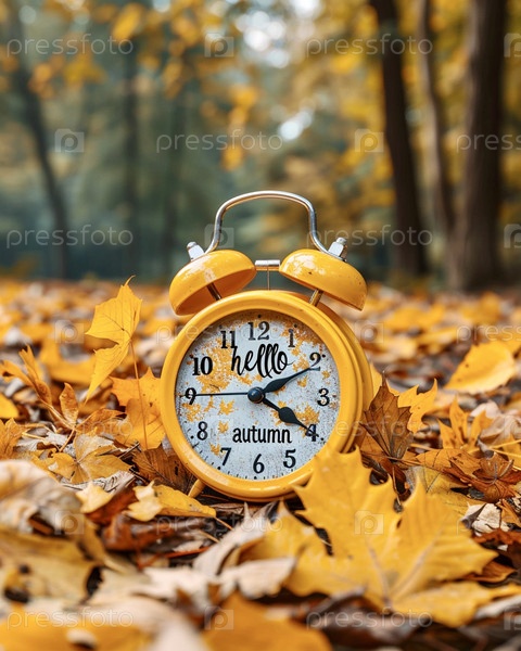 Желтый будильник с надписью "Привет, осень" среди листвы в солнечный осенний день