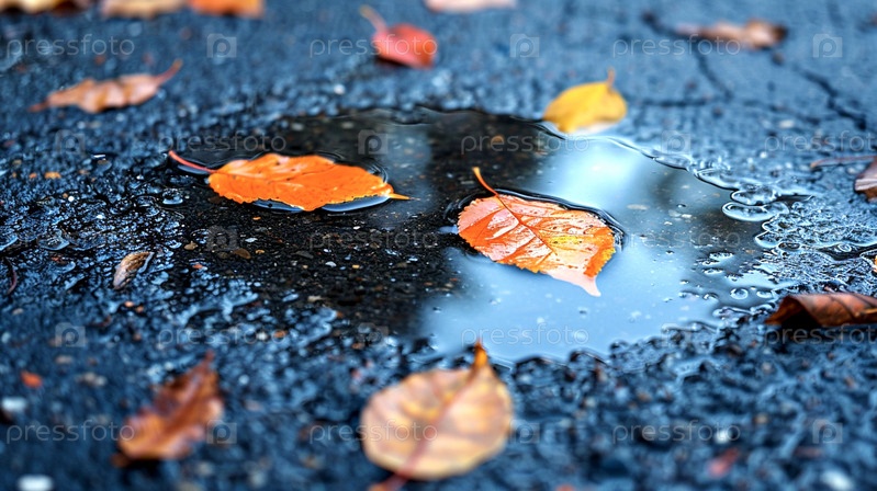 Осенний день, лужи на асфальте, в которых плавают желтые опавшие листья яблонь и берез