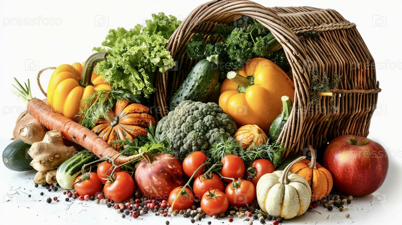Плетеная корзина лежит на боку, из нее выпадают осенние овощи: тыква, помидоры, огурцы, яблоки, морковь на сплошном белом фоне