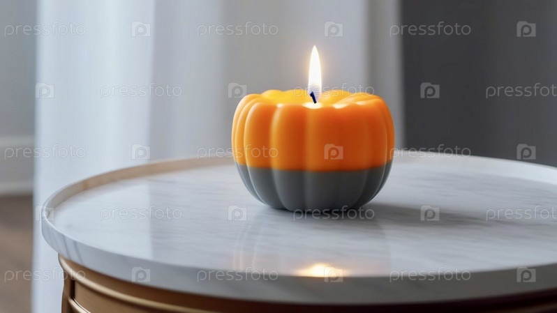 Оранжевая свеча в виде тыквы стоит на круглом светлом столе