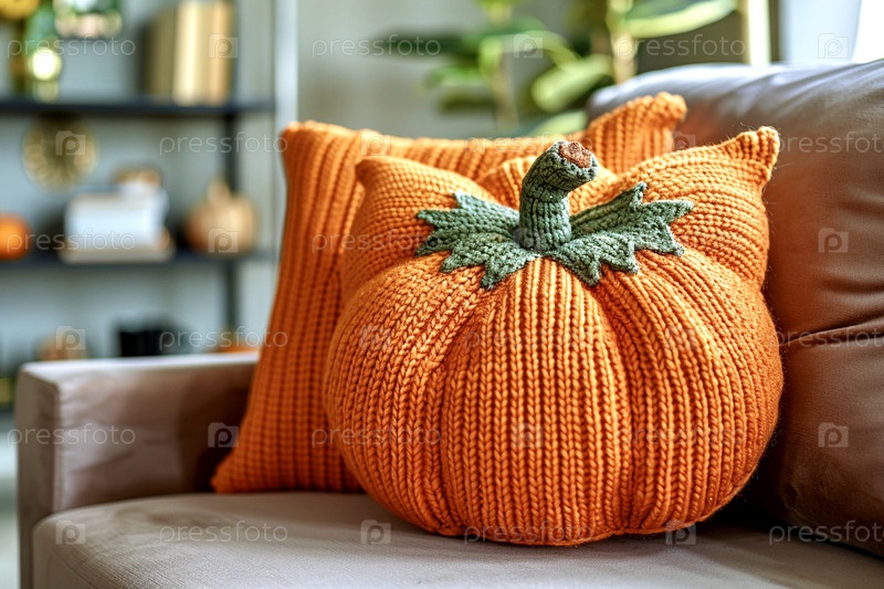 На коричневом диване лежит оранжевая вязаная подушка в форме тыквы