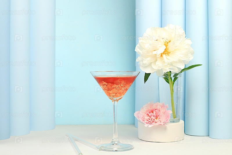 Современный летний натюрморт с розовым мартини, алкогольным коктейлем и цветами пиона на элегантном современном фоне, минимальная концепция бара и праздничной вечеринки, кафе, рекламный баннер, выборочный фокус,