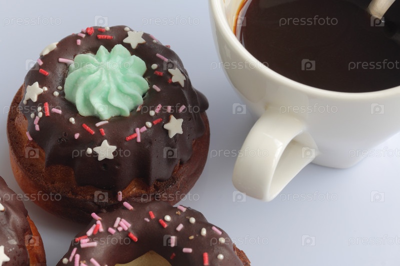 Торты в шоколадной глазури с декоративной начинкой. Расположен в форме треугольника. Рядом стоит чашка кофе