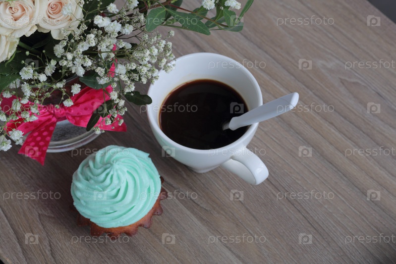 Кремовый торт и чашка кофе. Кофейную ложку опускают в кофейную чашку. Рядом стоит букет цветов в стеклянной вазе