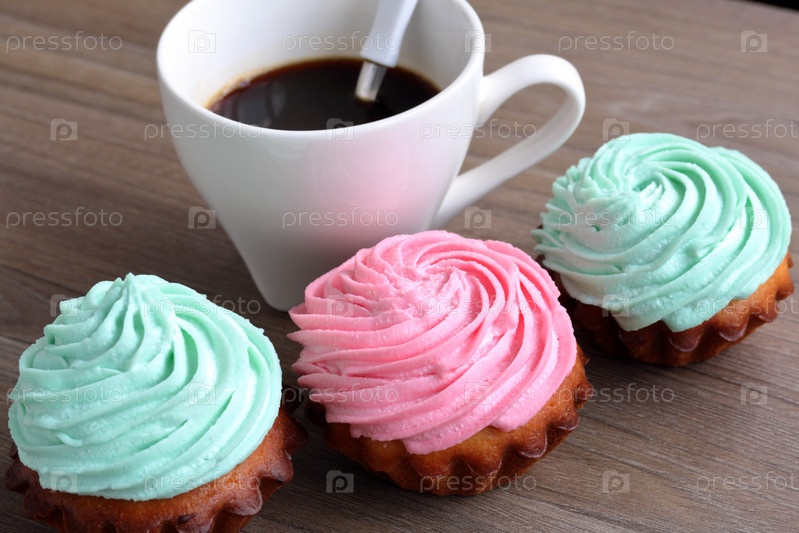 Три кремовых торта разных цветов и чашка кофе. Кофейную ложку опускают в кофейную чашку
