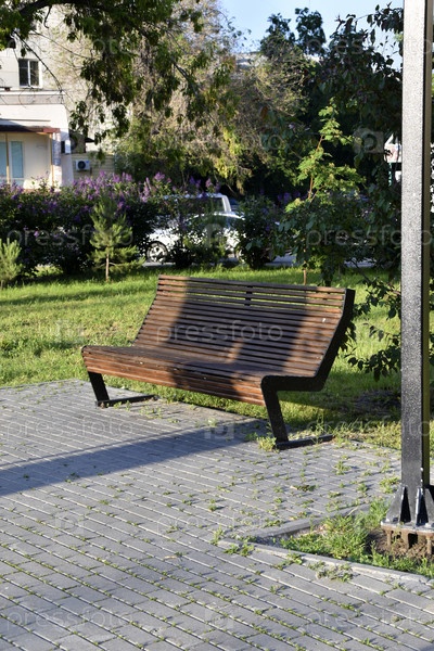 Черная деревянная скамейка в городе вечером. Место для отдыха в парке