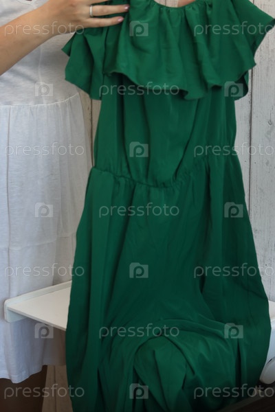 Женщина делает обзор летнего платья зеленого цвета. Кладет на стол