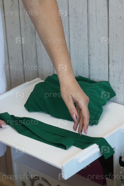 Женщина делает обзор летнего платья зеленого цвета. Кладет на стол