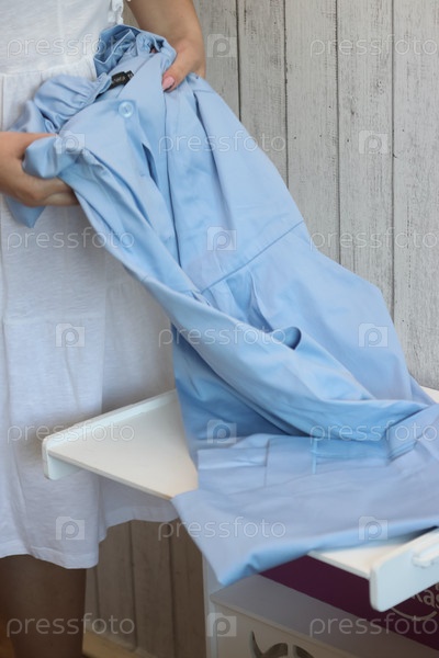 Женщина делает обзор летнего платья синего цвета. Кладет на стол