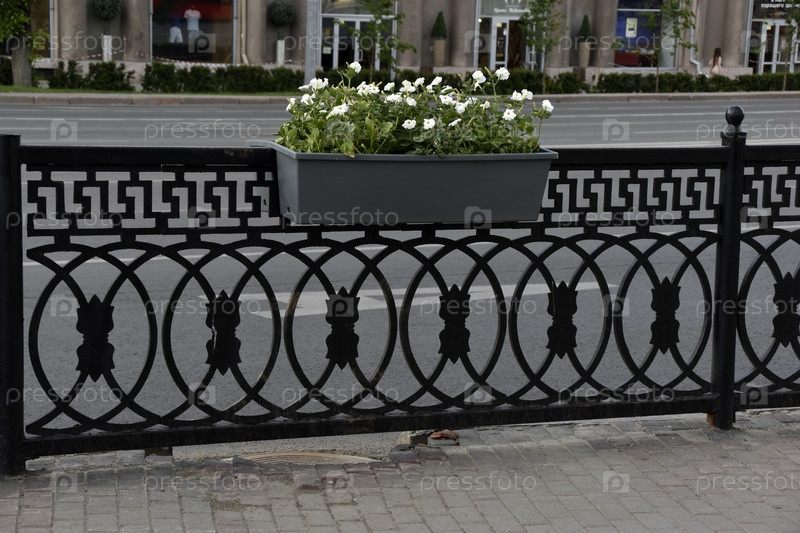 Красочные цветы петунии в клумбах на заборах в городе. Благоустройство города. Петуния никтагинифлора