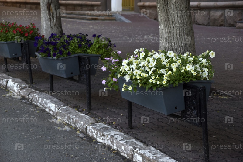 Красочные цветы петунии в клумбах на заборах в городе. Благоустройство города. Петуния никтагинифлора