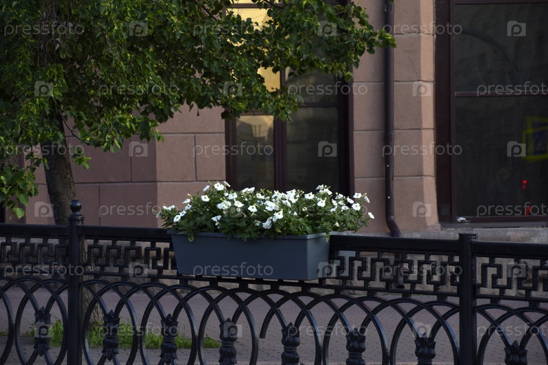 Красочные цветы петунии в клумбах на заборах в городе. Благоустройство города. Петуния никтагинифлора