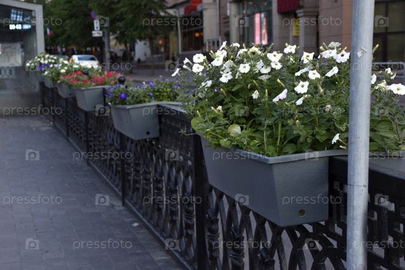 Красочные цветы петунии в клумбах на заборах в городе. Благоустройство города. Петуния никтагинифлора