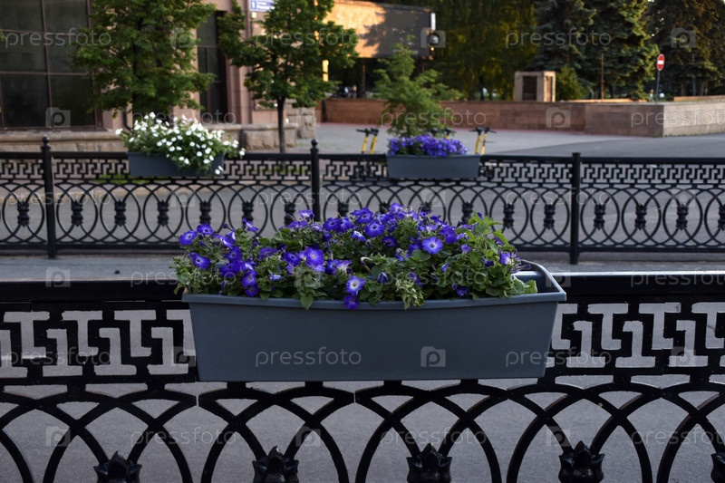 Красочные цветы петунии в клумбах на заборах в городе. Благоустройство города. Петуния никтагинифлора