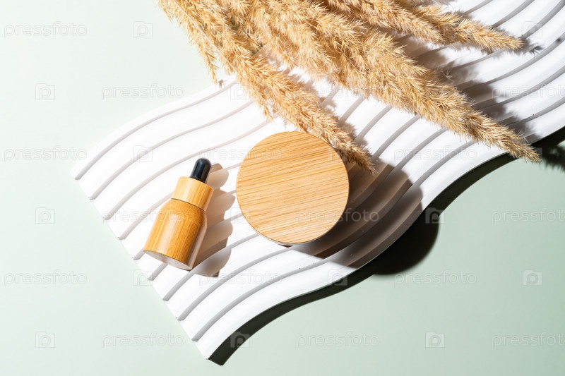 Набор косметических товаров в бамбуковых флаконах на белых подиумах на зеленом фоне. Набор для ежедневного ухода за кожей. Мокап для дизайнеров
