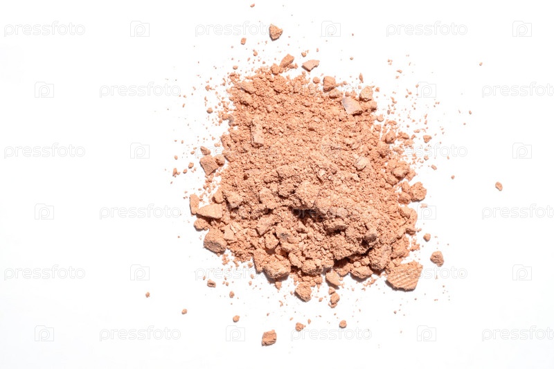 Полупрозрачная рыхлая компактная текстура порошка, выделенная на белом фоне. Образец косметической продукции
