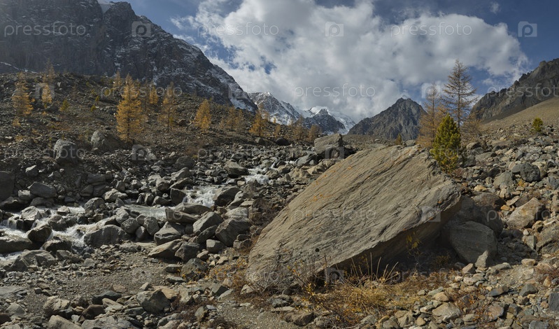 Россия. Юг Западной Сибири, горный Алтай. Осенний вид на долину реки Актру, исток которой находится у подножия ледника на горном хребте Северный Чай