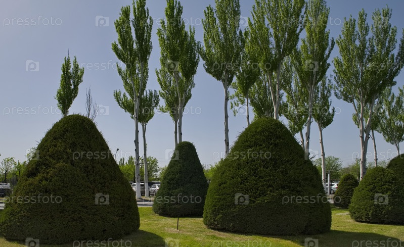 Кыргызстан, Бишкек. Аллея с ухоженными туями и пирамидальными тополями на дороге в международный аэропорт Манас