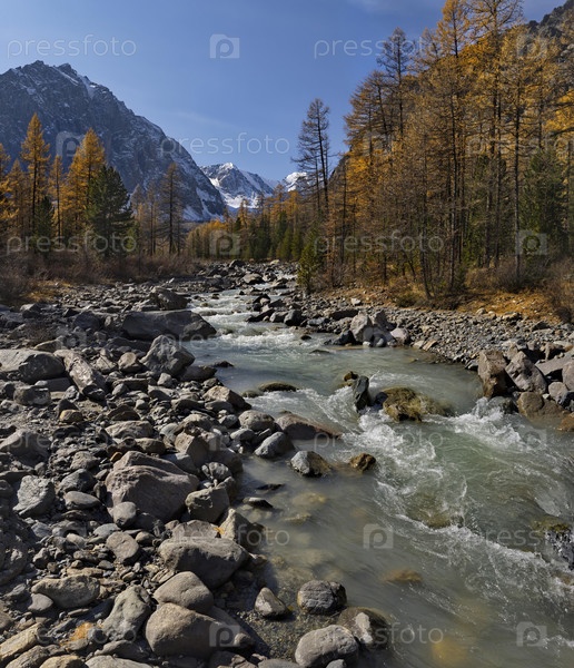Россия. Юг Западной Сибири, горный Алтай. Осенний вид на долину реки Актру, исток которой находится у подножия ледника на горном хребте Северный Чай