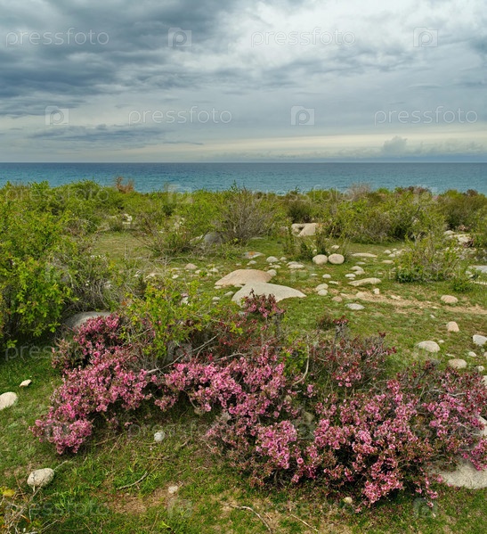 Кыргызстан, Тосор. Цветущие розовым цветом кусты карликовой вишни на каменистом Южном берегу озера Иссык-Куль