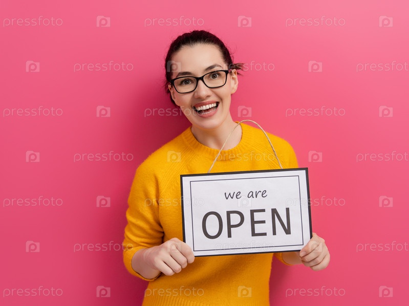 Владелец бизнеса держит табличку о возобновлении работы