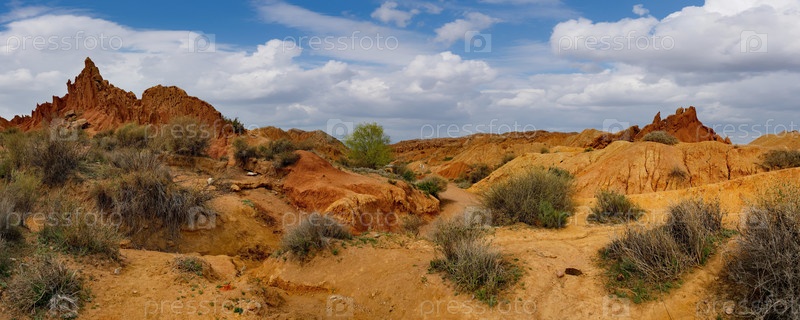 Кыргызстан, восточный берег озера Иссык-Куль. Вид на степную долину реки Арашан с редкими одинокими елями среди заросших гор
